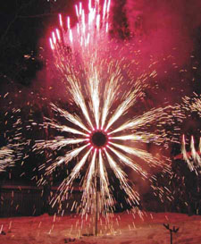 Наземный фейерверк - это фейерверк, высота действия которого не превышает 5 - 7 метров. К такому фейерверку относятся различные виды пиротехнических фигур или других элементов: фонтаны (или группы фонтанов), свечи, слова, товарные знаки, любые другие фигуры бриллиантового огня, пиротехнические фигуры: "огненная мельница", "горящие сердца" и т.д.